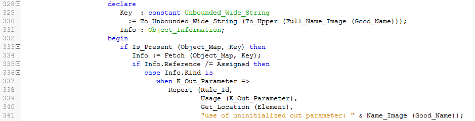 | Assignments (x6) | Controls issues related to assignments, like array sliding, access values duplication, multiple assignments to a same variable, assignments to components of a structured variable that could be replaced by aggregate assignment, or possible usage of the "@" target name. |